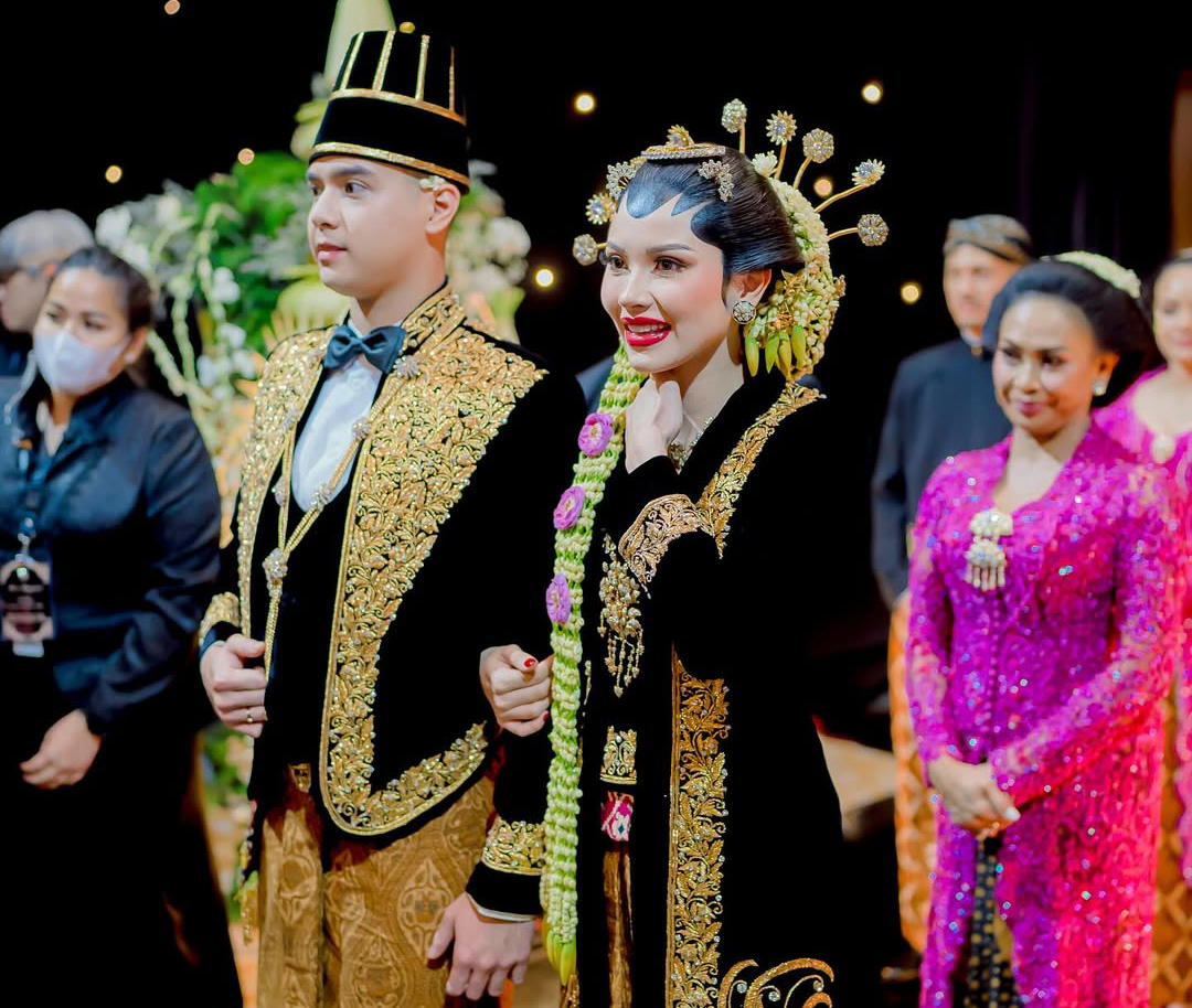 Sementara Alyssa tampil memukau dalam balutan kebaya beludru hitam berhias payet emas serta bawahan kain batik. Ornamen yang menempel di area lokasi Ngunduh Mantu juga kental nuansa Jawa yang otentik sekaligus elegan.