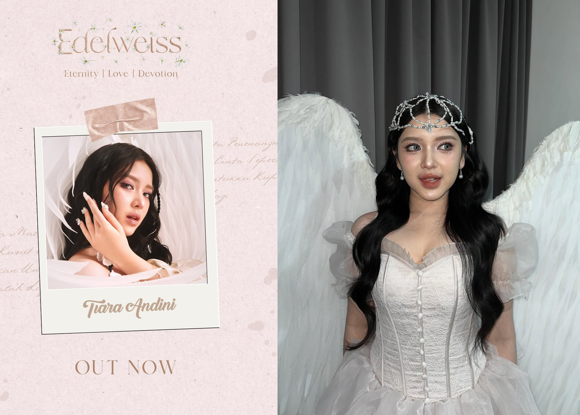 Dalam unggahan di akun Instagram pribadinya, @tiaraandini, Tiara membagikan visual album Edelweiss yang tampil anggun dan elegan — mengenakan busana putih bernuansa dreamy, lengkap dengan sayap indah dan detail kuku senada.