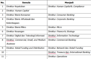 Selain itu, terdapat pula perubahan nomenklatur jabatan sejumlah direktur sesuai kebutuhan bisnis dan tantangan industri perbankan ke depan. RUPST juga mengalihkan penugasan beberapa direksi untuk memperkuat struktur organisasi.