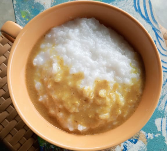 - Sajikan bubur ayam dengan kuah kuning dan bahan pelengkap.