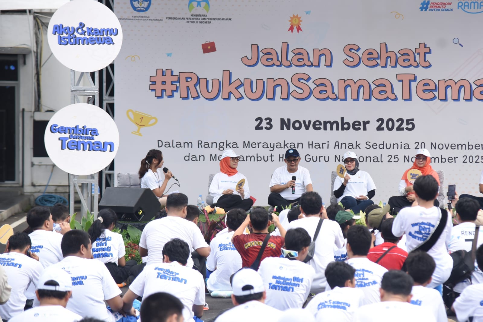WANITAINDONESIA.CO – Memperingati Hari Anak Sedunia dan menjelang Hari Guru Nasional, Kementerian Pendidikan Dasar dan Menengah (Kemendikdasmen) melalui Pusat Penguatan Karakter (Puspeka) berkolaborasi dengan Kementerian Pemberdayaan Perempuan dan Perlindungan Anak (Kemen PPPA) menyelenggarakan kegiatan Jalan Sehat bertajuk #RukunSamaTeman pada Minggu (23/10).