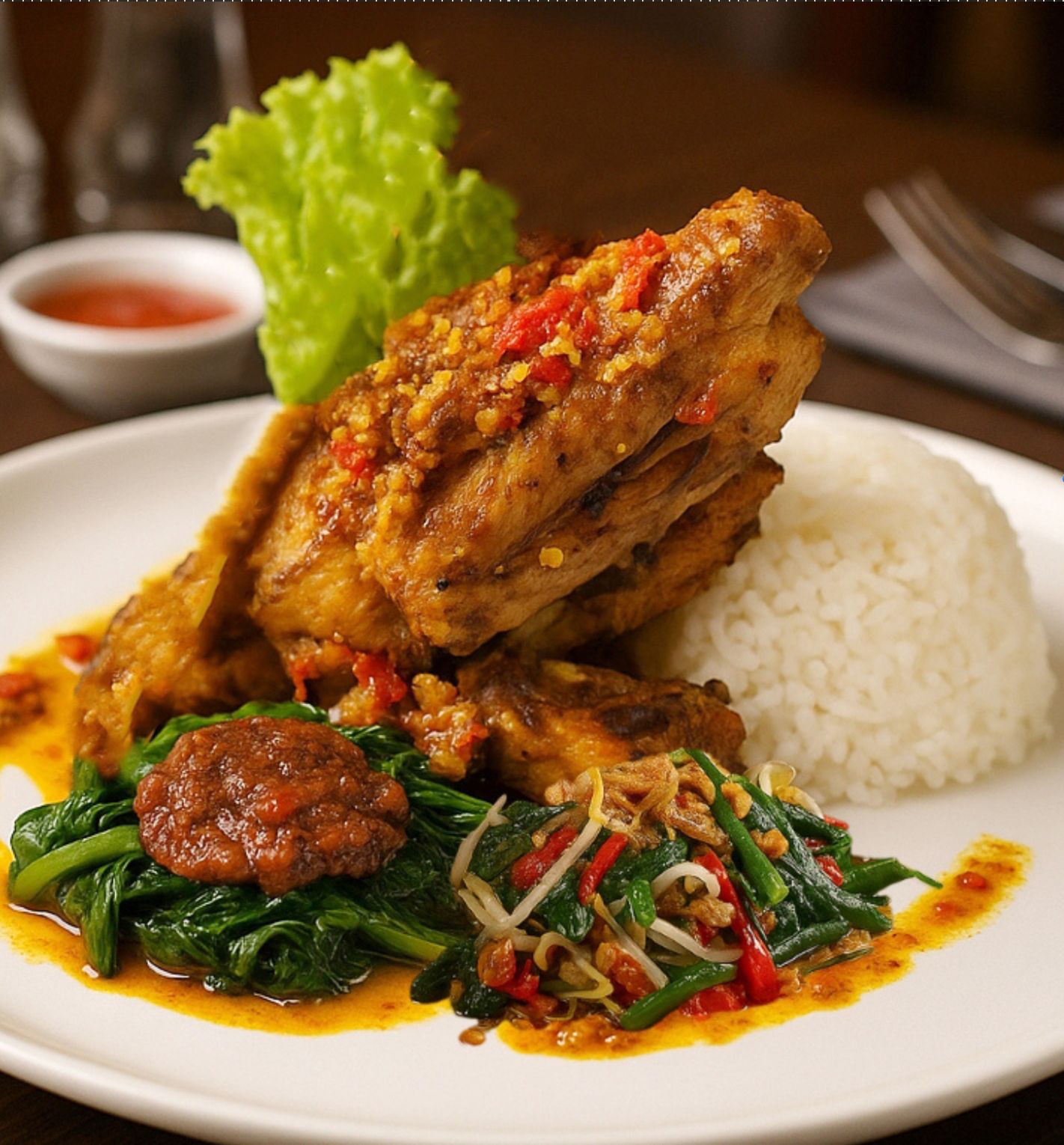 - Bebek Betutu : bebek Bali, rempah tradisional, sambal embe, sayuran, nasi uap