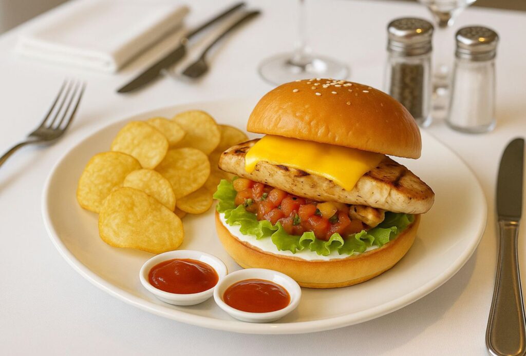 - Chicken Burger with Creamcheese : ayam panggang, roti burger, salsa, krim keju, kejucheddar, selada, keripik kentang