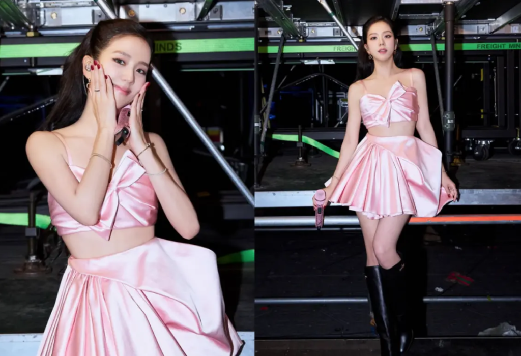 Jisoo tampil memukau mengenakan outfit custom berbahan sutra, terdiri dari atasan cropped bra dan rok mini berlipit. Sentuhan menarik terlihat pada spaghetti strap yang dipadukan dengan pita dramatis di satin monokrom, menciptakan nuansa playful khas Jonathan Anderson. Pita ini dirancang dengan posisi miring, menampilkan gaya unik yang terinspirasi dari koleksi Musim Semi Pria 2026 Anderson. - Detail pengerjaan yang mengesankan