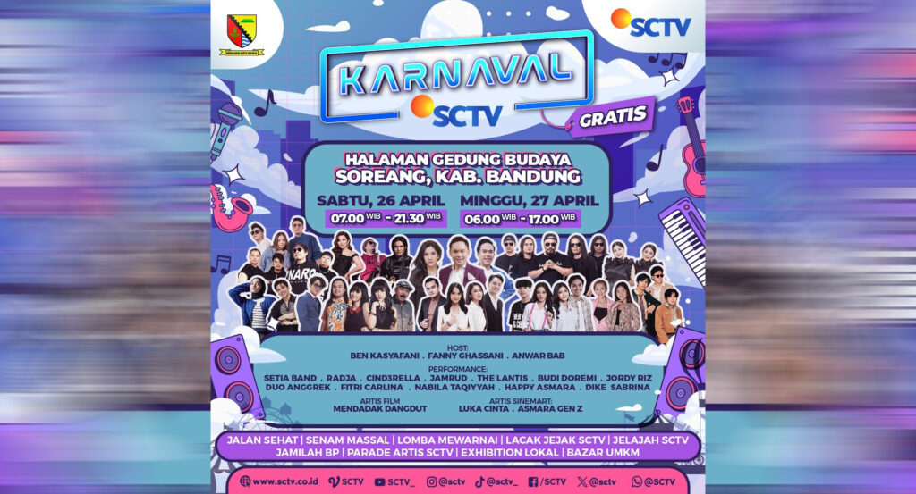 Edisi perdana Karnaval SCTV di tahun 2025 ini akan berlangsung selama dua hari berturut-turut, yakni di hari Sabtu-Minggu, 26-27 April 2025 bertempat di Halaman Gedung Budaya Soreang, Kabupaten Bandung.