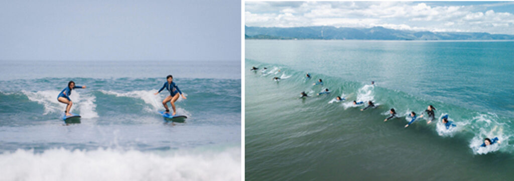 - Sesi pelatihan selancar untuk pemula dan menengah, dipandu oleh pelatih
