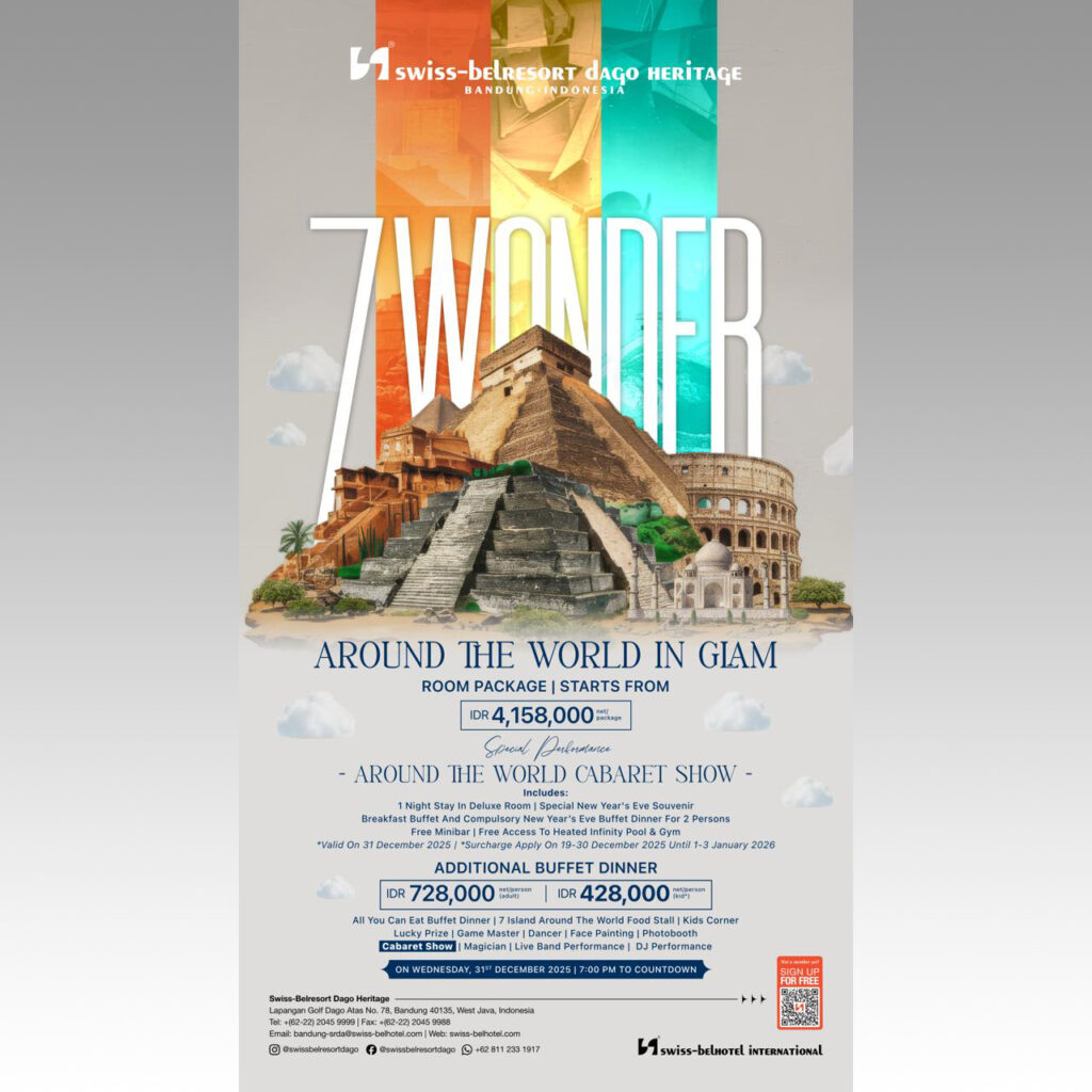 Jika saat Natal tamu dimanjakan dengan suasana hangat dan tradisional, maka malam Tahun Baru di Swiss-Belresort Dago Heritage Bandung menghadirkan panggung penuh gemerlap dan hiburan. Konsep 7 Wonders – Around the World in Glam menjadi latar belakang pesta akhir tahun yang menghadirkan perjalanan rasa lintas budaya dan rangkaian pertunjukan menarik sepanjang malam.
