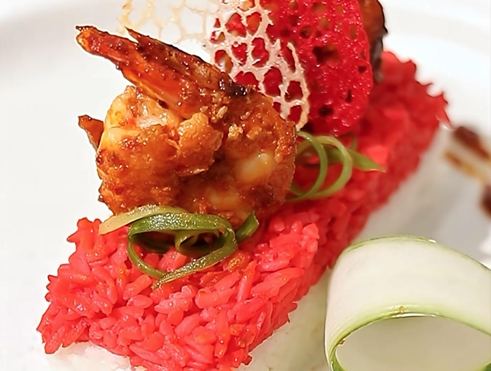 - Cetak nasi dari warna putih ke merah dengan cetakan lalu beri garnish daun bawang dan udang di atasnya.